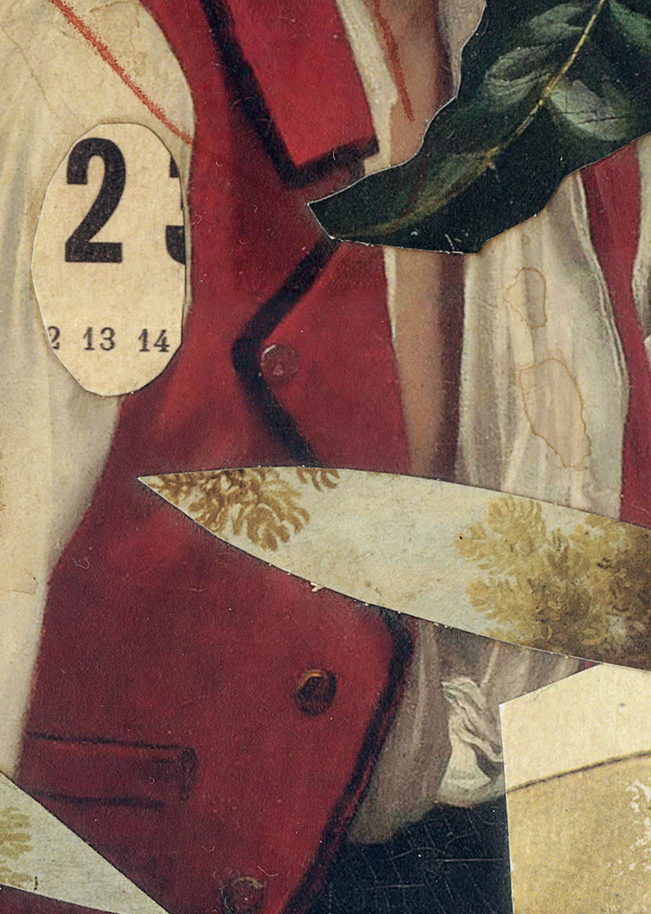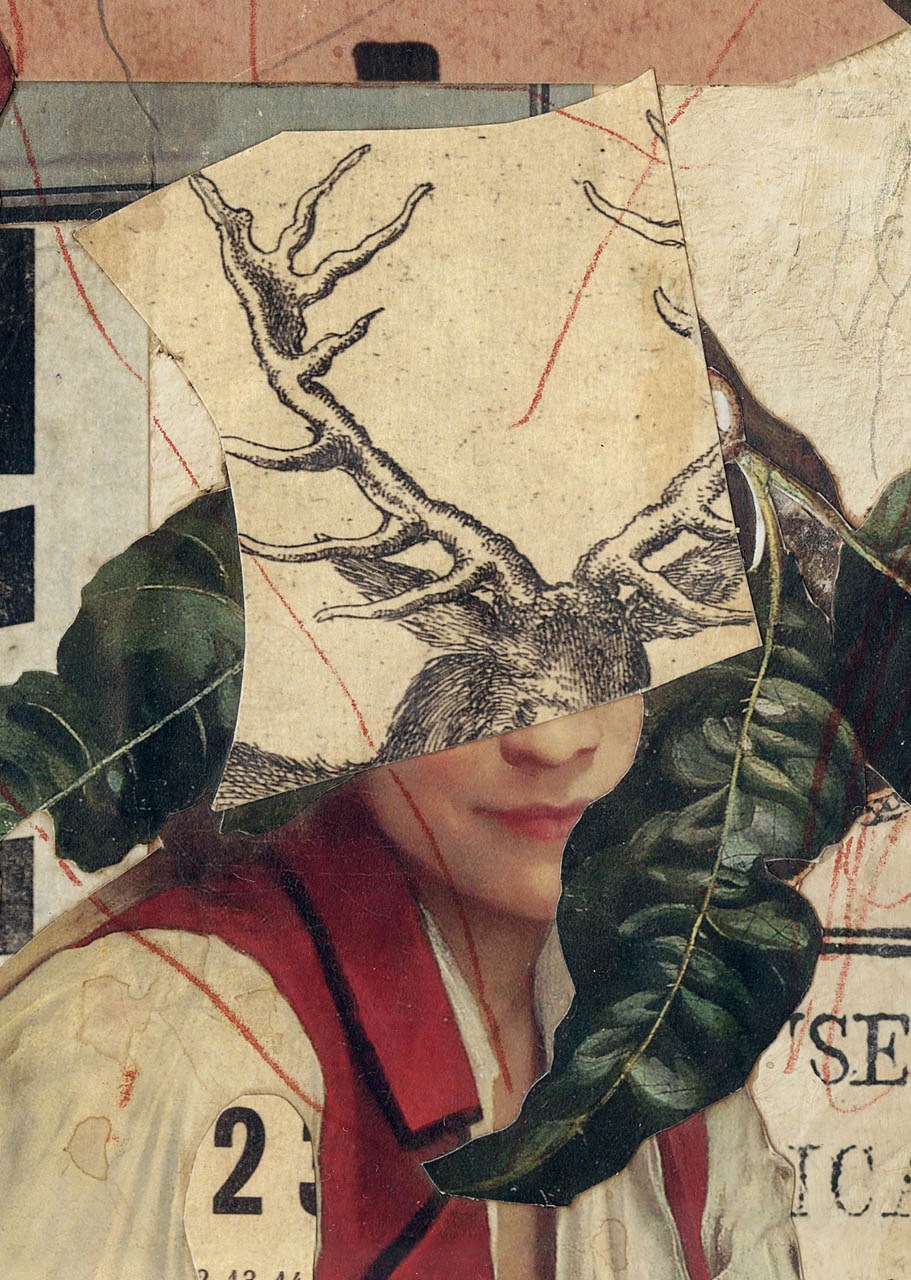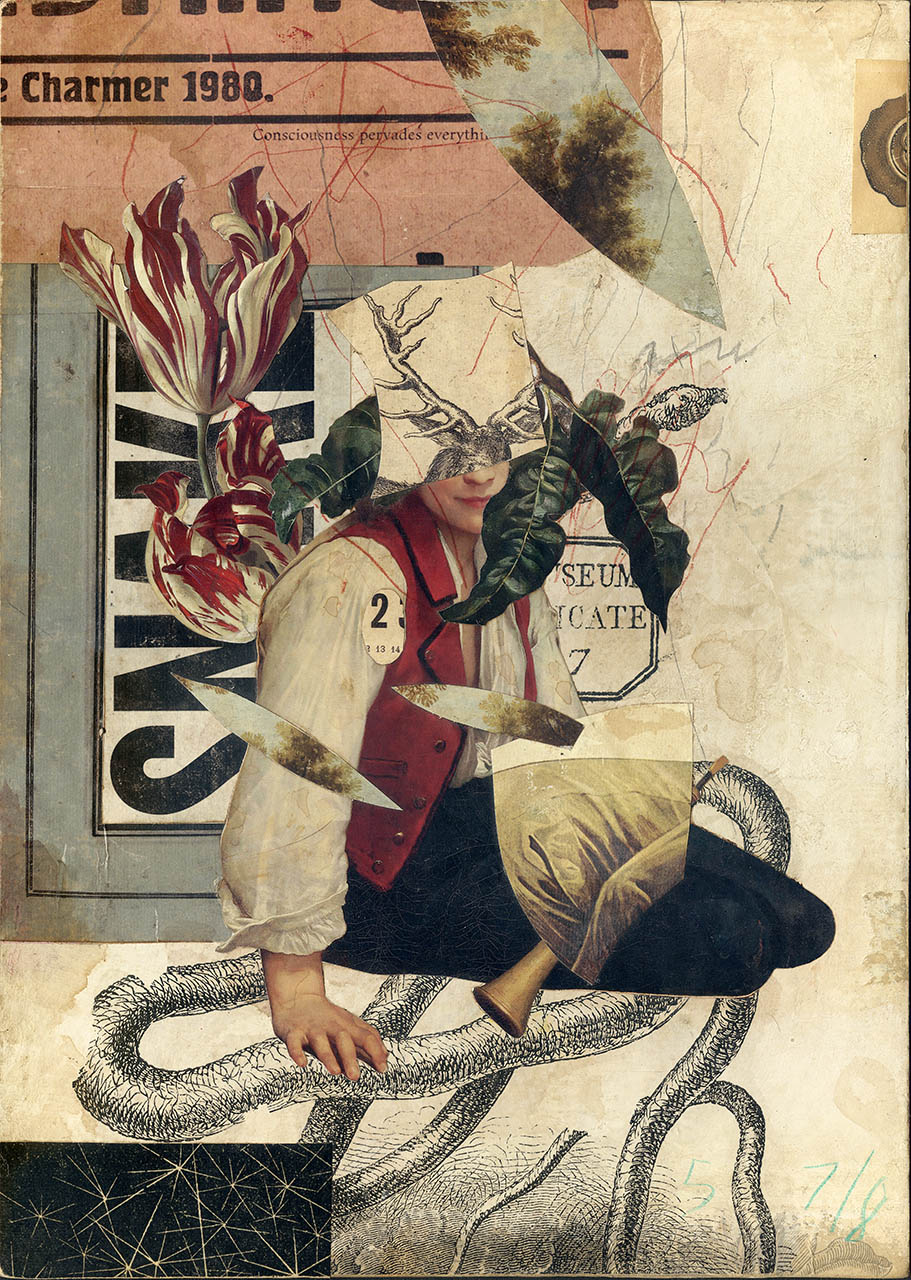 This is an original and unique handmade mixed-media collage on paper, assembled on grayboard. (2021)